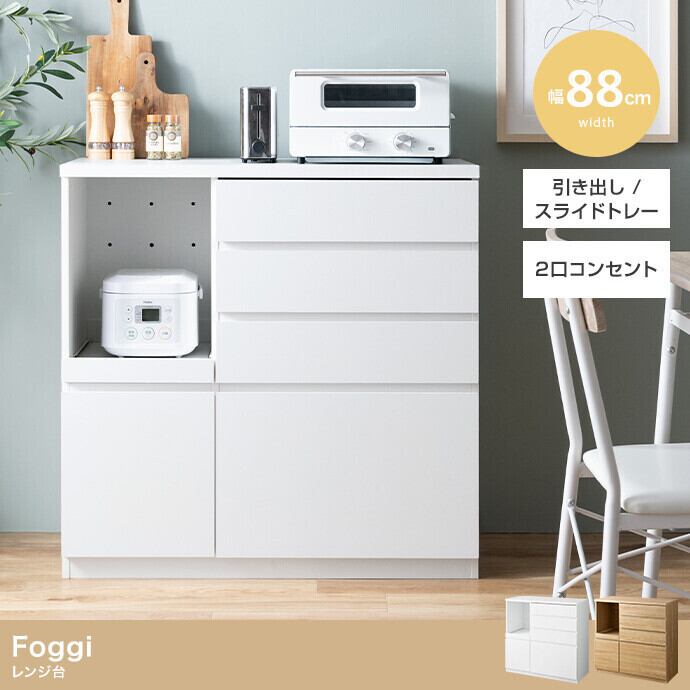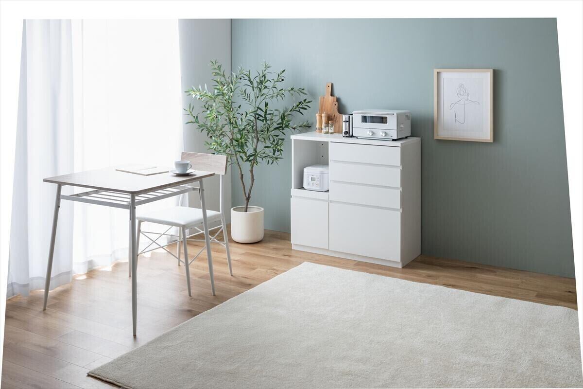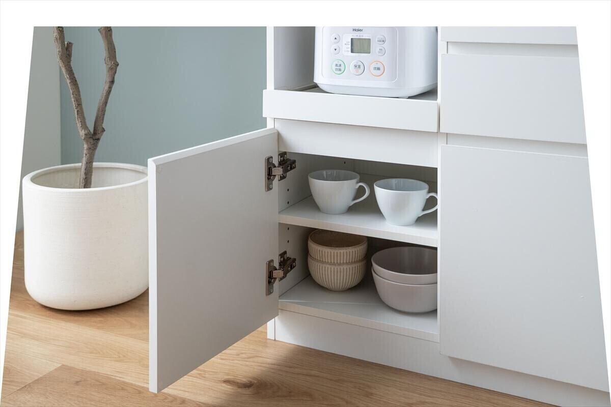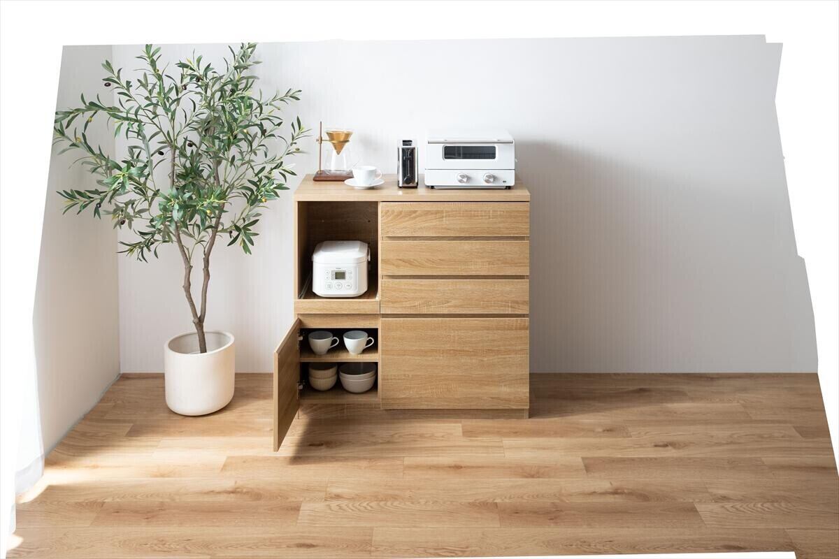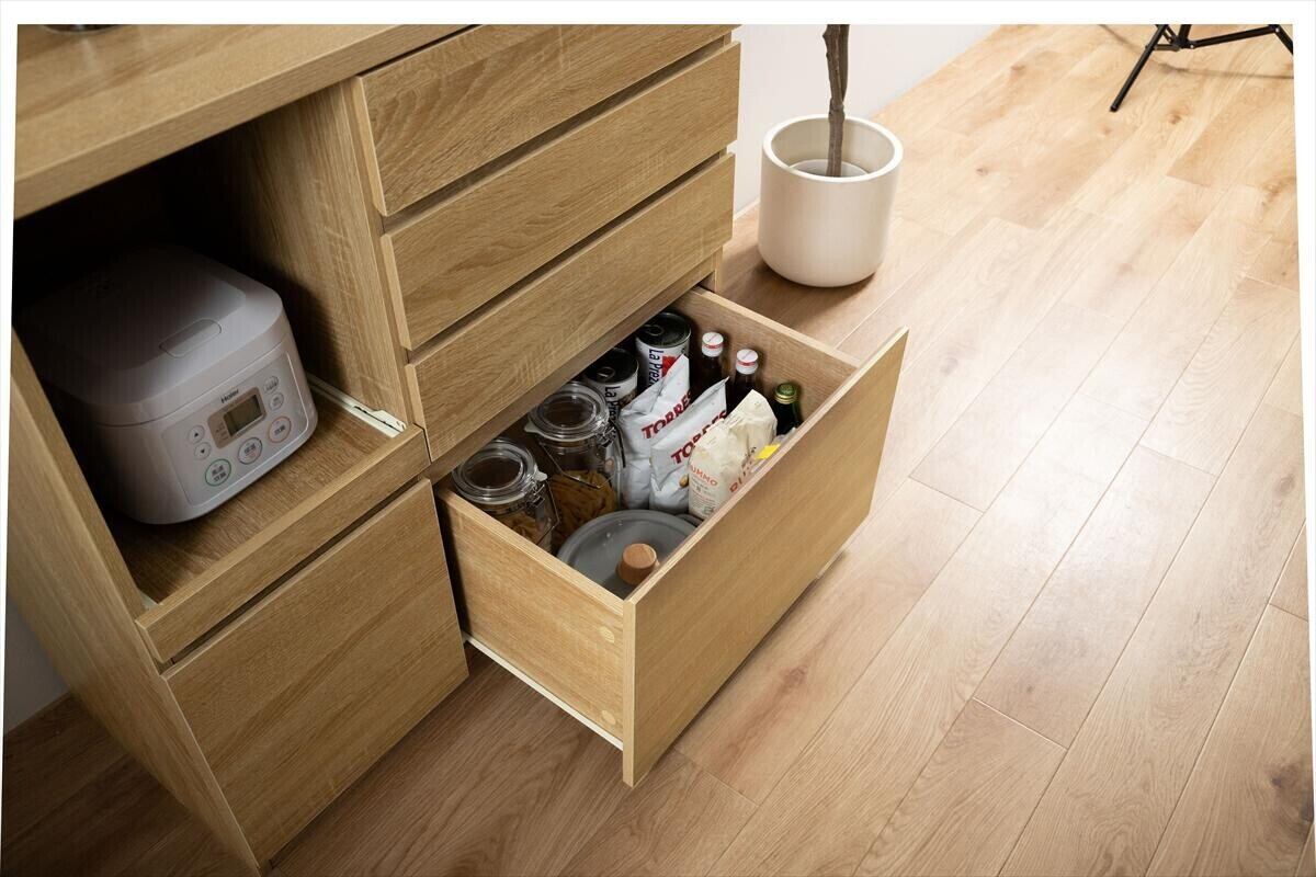 レンジ台。コンパクトながら4杯の引き出し、オープン収納、扉収納を備え、充実した収納力を実現しました。
