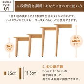 5cmと18.5cm の継ぎ脚を使って、高さを4段階に調整できます。