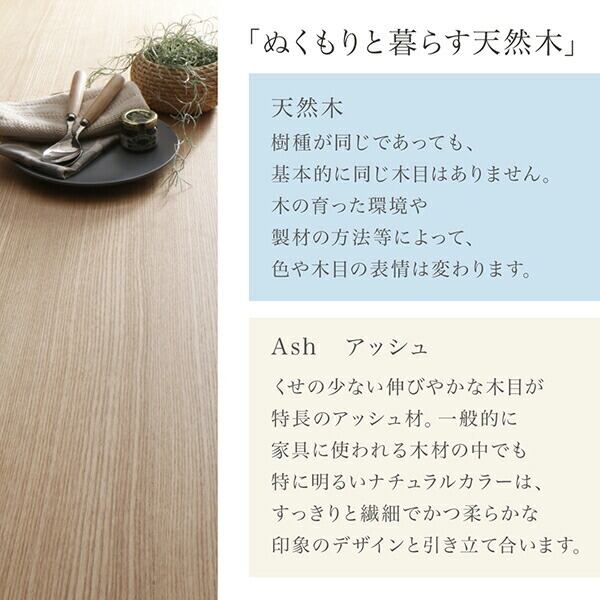 幅150cmのワイドなダイニングテーブルは天然木で優しい雰囲気に。