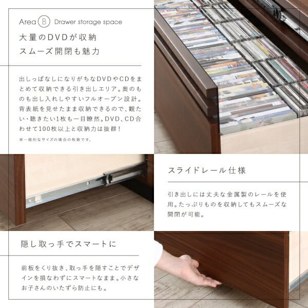 AV機器を2台並べて使えるエリア、DVDやCDを立てて収納できる引き出しエリア、ルーターや外付けハードディスクなどを収納できる扉エリアの3エリアで構成。
