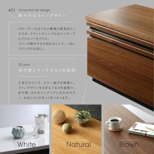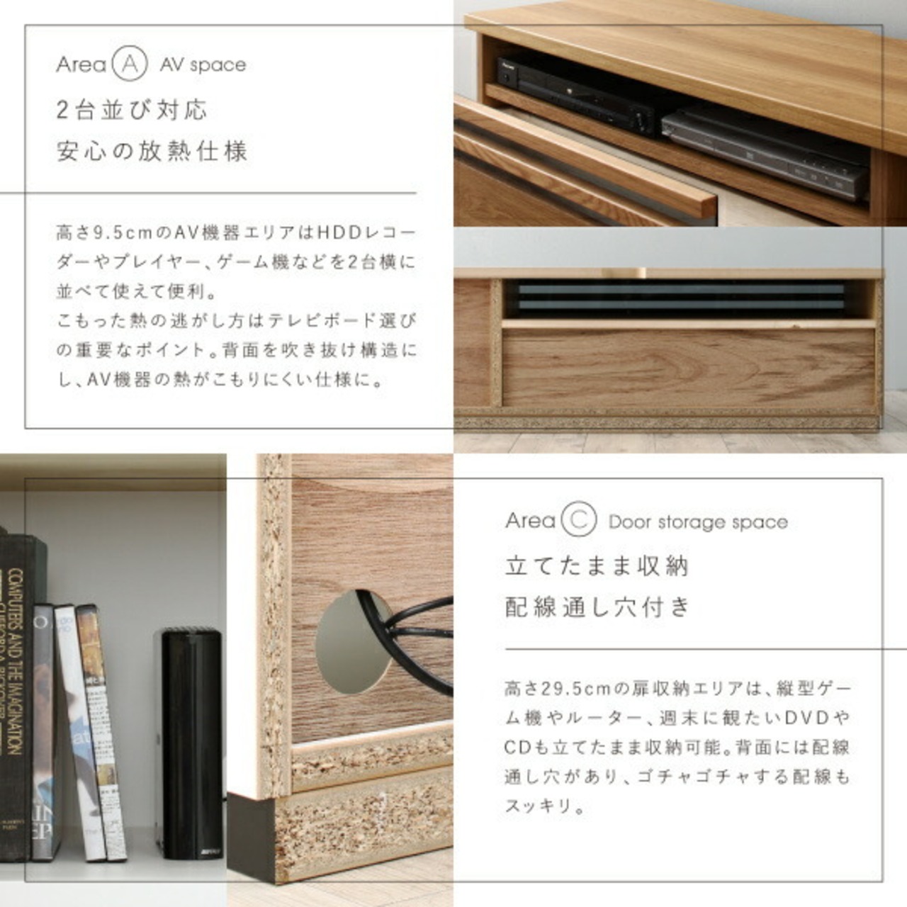 AV機器を2台並べて使えるエリア、DVDやCDを立てて収納できる引き出しエリア、ルーターや外付けハードディスクなどを収納できる扉エリアの3エリアで構成。