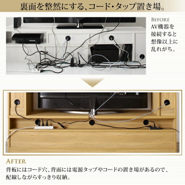 背板にはコード穴、背面には電源タップやコードの置き場があるので、
