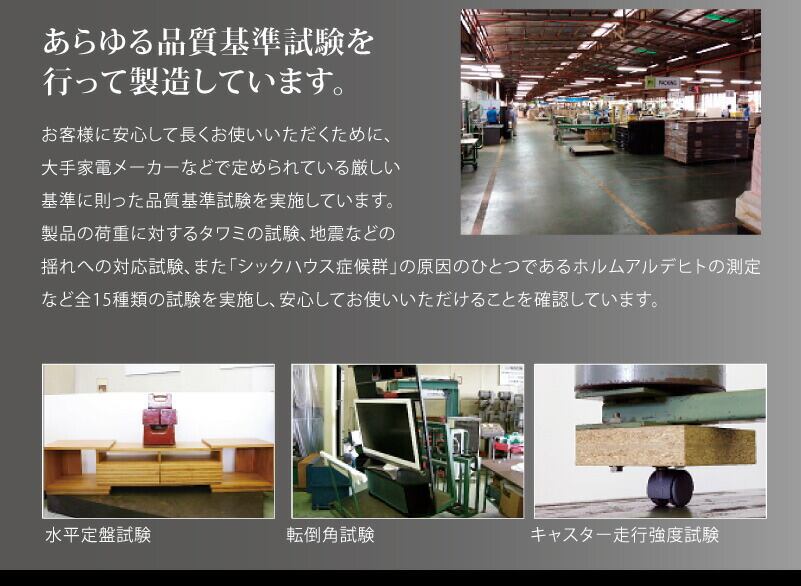 製品の荷重に対するタワミの試験、地震などの揺れへの対応試験、また「シックハウス症候群」の原因のひとつであるホルムアルデヒドの測定などを含める全15種類の試験を実施し、安心してお使いいただける製品であることが確認されてからお客様のもとに出荷されます。