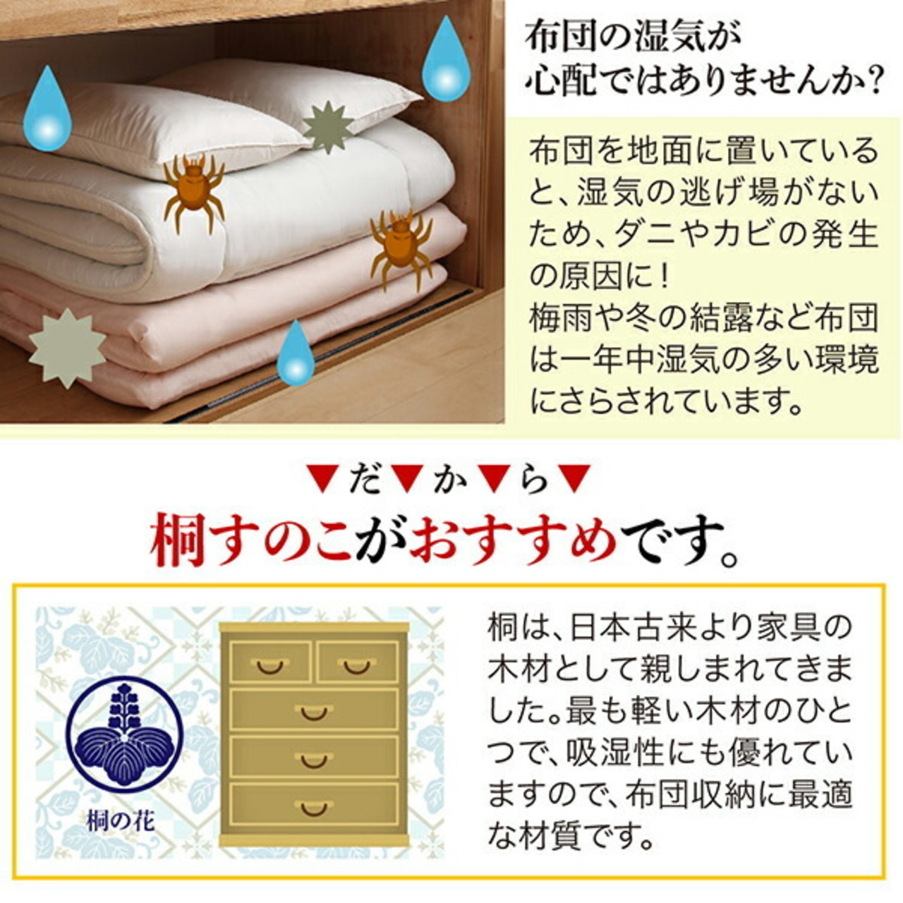 桐すのこは、通気性が抜群なので、布団に発生しやすいダニやカビを防ぎます。