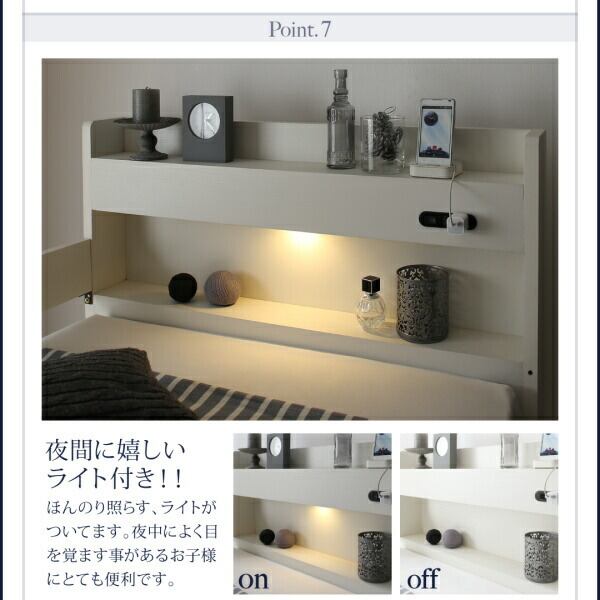 ヘッドボードもフットボードもたっぷり収納できる棚。
