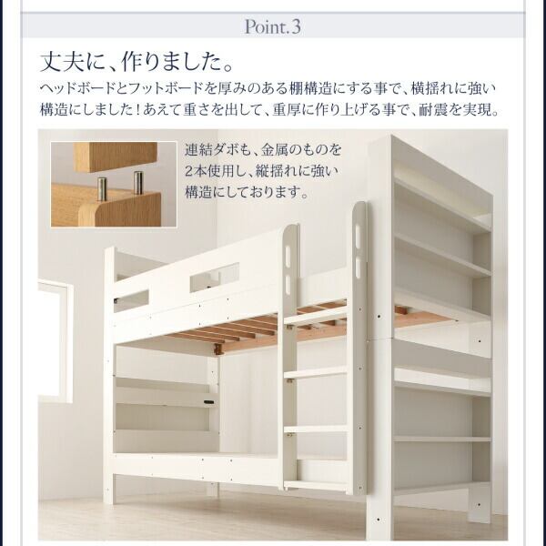 ヘッドボードとフットボードを厚みのある棚構造にする事で、横揺れに強い構造にしました!