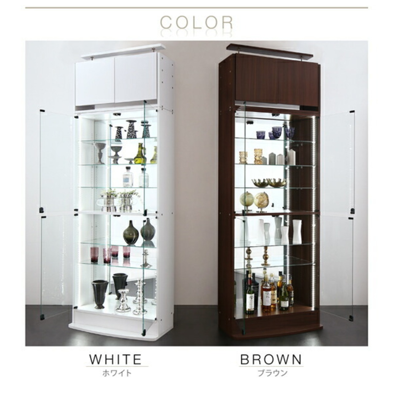 棚の背面にミラーがあることにより、全体を明るく、一層見栄えをよくします。