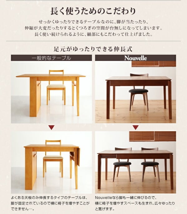 伸縮式のテーブルなら、生活の変化とともにテーブルのサイズを変えることができ、使い続けることができます。