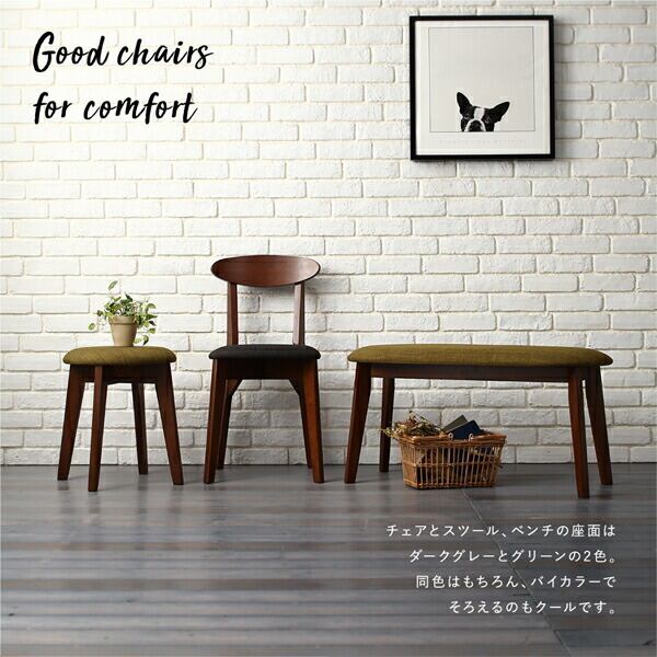 チェアとスツール、ベンチの座面はダークグレーとグリーンの2色。