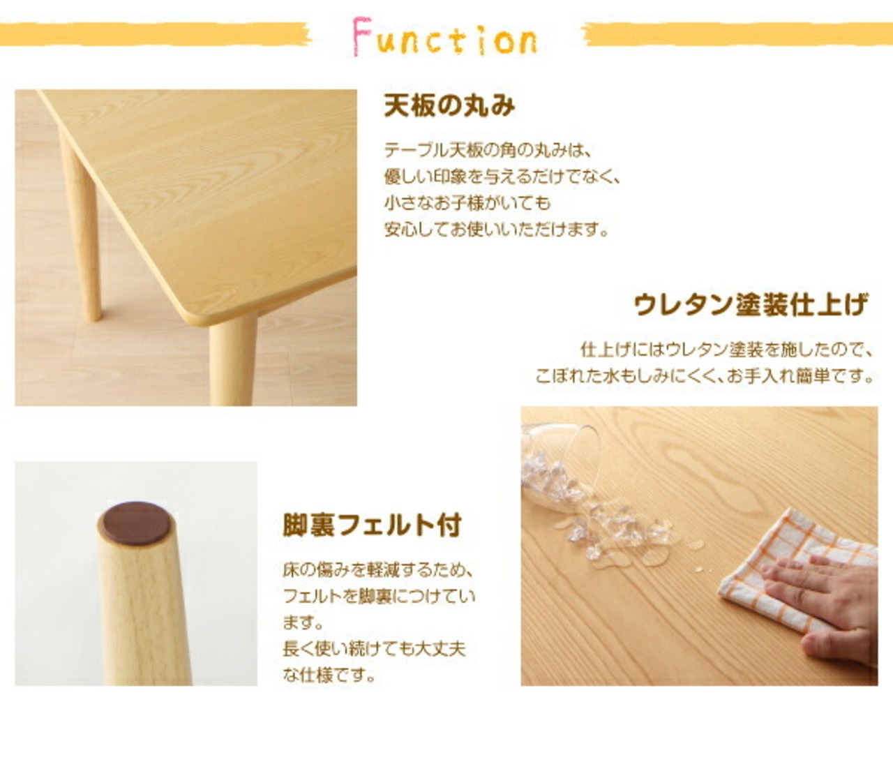 仕上げにはウレタン塗装を施したので、こぼれた水もしみにくく、お手入れ簡単です。