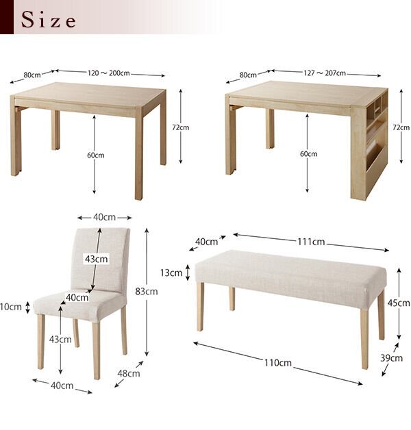 無段階に広がる スライド伸縮テーブル ダイニングセット Magie+ マージィプラス/4点:テーブル+チェア×2+ベンチ: シンプルタイプ