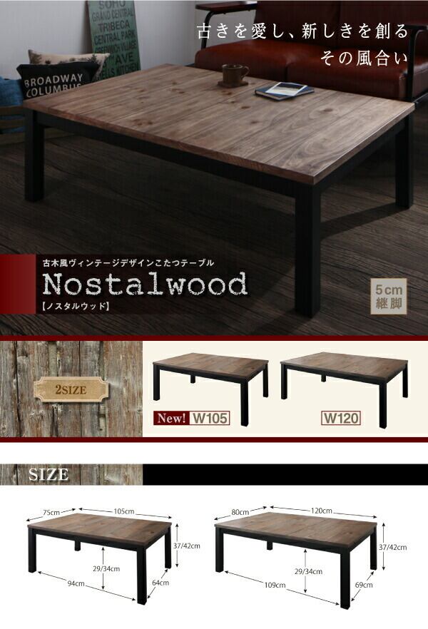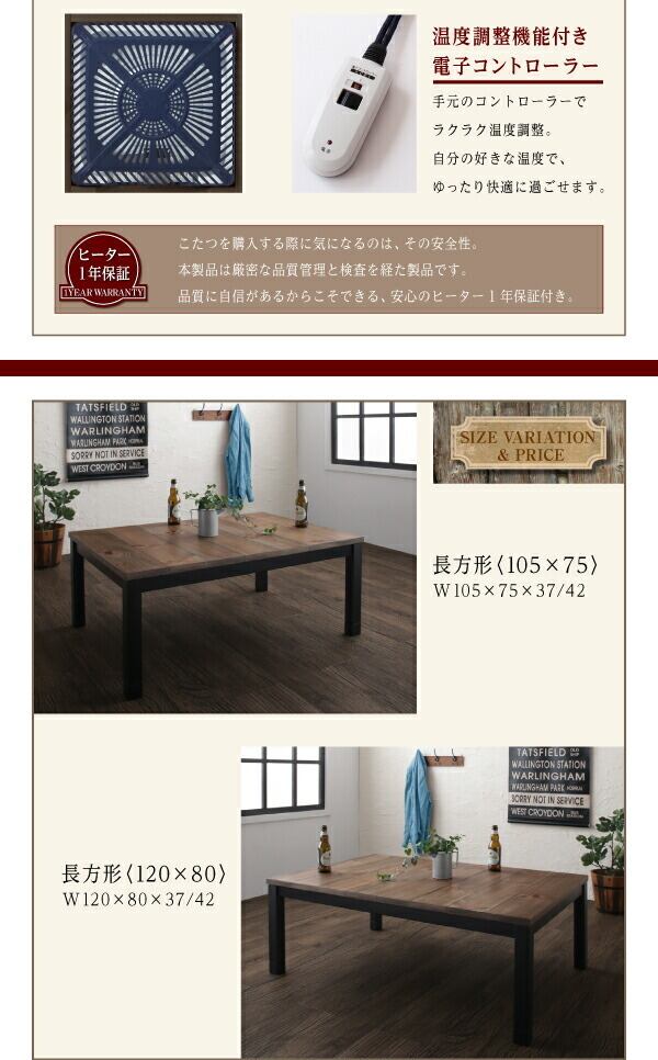 古木風ヴィンテージデザインこたつテーブル Nostalwood:長方形(75×105cm)