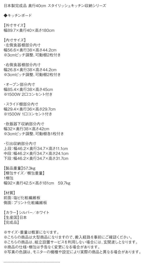 日本製完成品 奥行40㎝ スタイリッシュキッチン収納シリーズ:キッチンボード