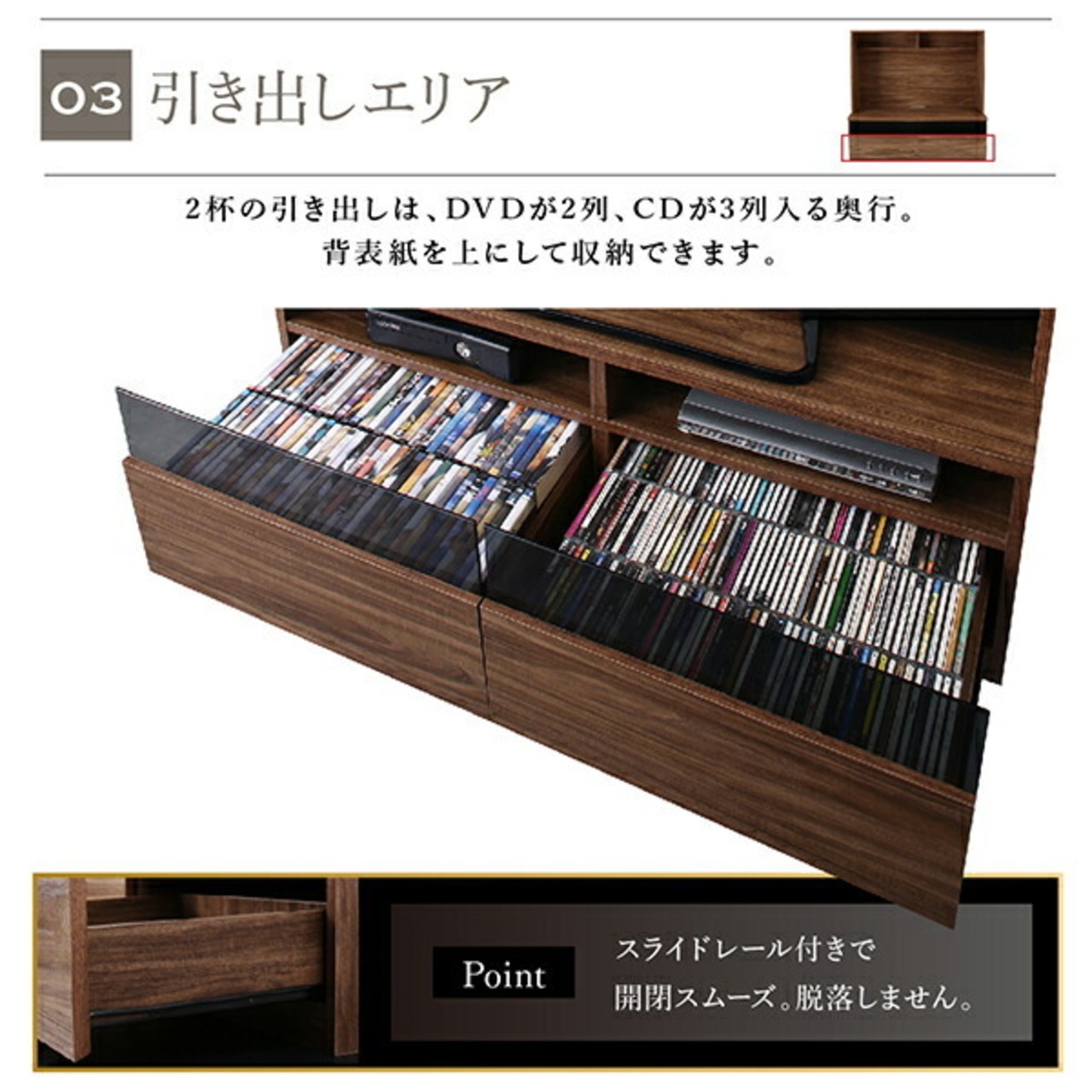 2杯の引き出しは、DVDが2列、CDが3列入る奥行。