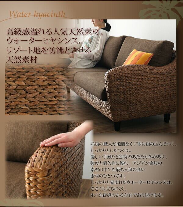 ウォーターヒヤシンスとファブリックのぬくもりある落ち着いた雰囲気が魅力的なソファ。