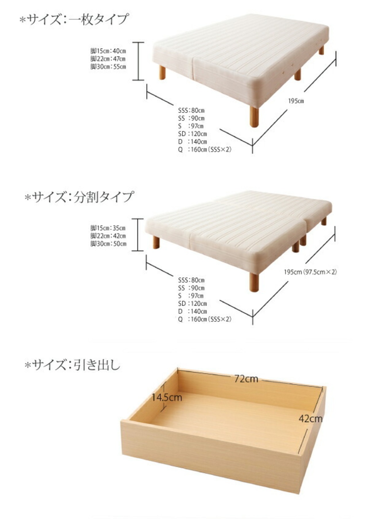 セミダブル: 分割タイプ 脚15cm