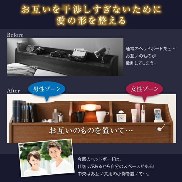 今回のヘッドボードは、仕切りがあるから自分のスペースがある!