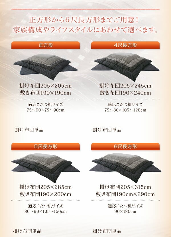 サイズ展開:正方形 /4尺長方形/5尺長方形/6尺長方形