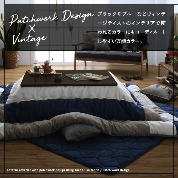 Kotatsu coverlet with patchwork design using suede-like fabric.