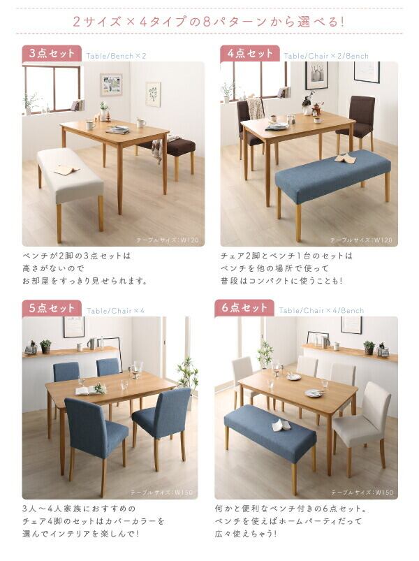 チェア2脚とベンチ1台のセットはベンチを他の場所