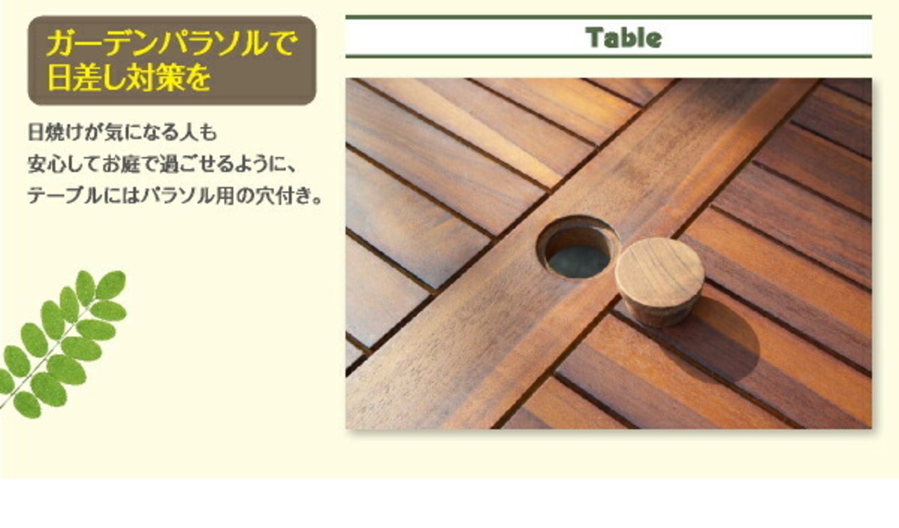 日焼けが気になる人も安心してお庭で過ごせるように、テーブルにはパラソル用の穴付き。