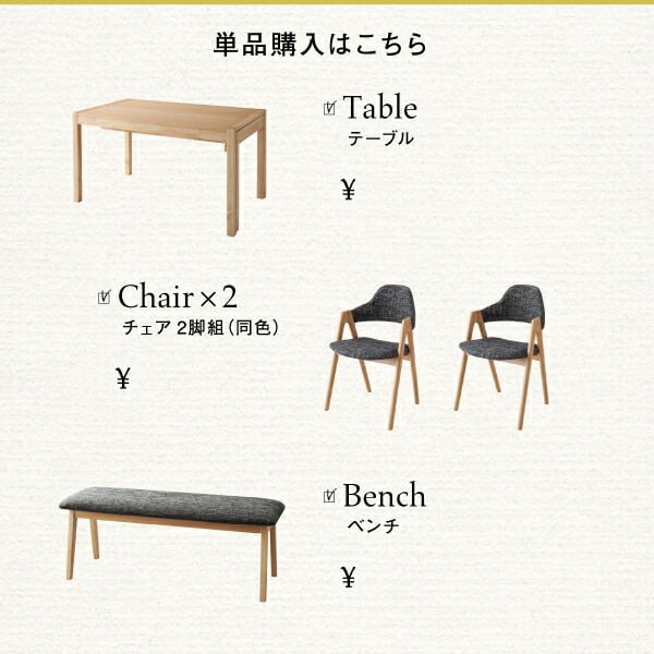4点:テーブル+チェア×2+ベンチ