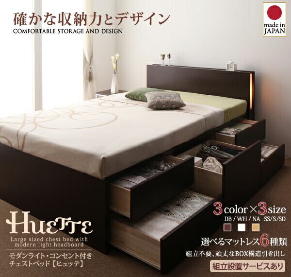 モダンライト・コンセント付きチェストベッド Huette ヒュッテ: シングル: 薄型スタンダードポケット付