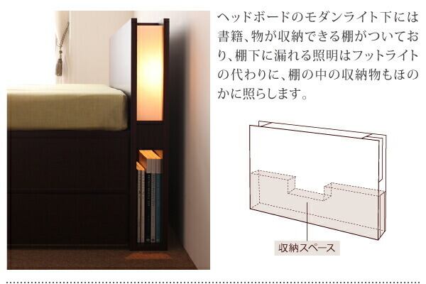 ヘッドボードのモダンライト下には書籍、物が収納できる棚がついており、棚下に漏れる照明はフットライトの代わりに、棚の中の収納物もほのかに照らします。