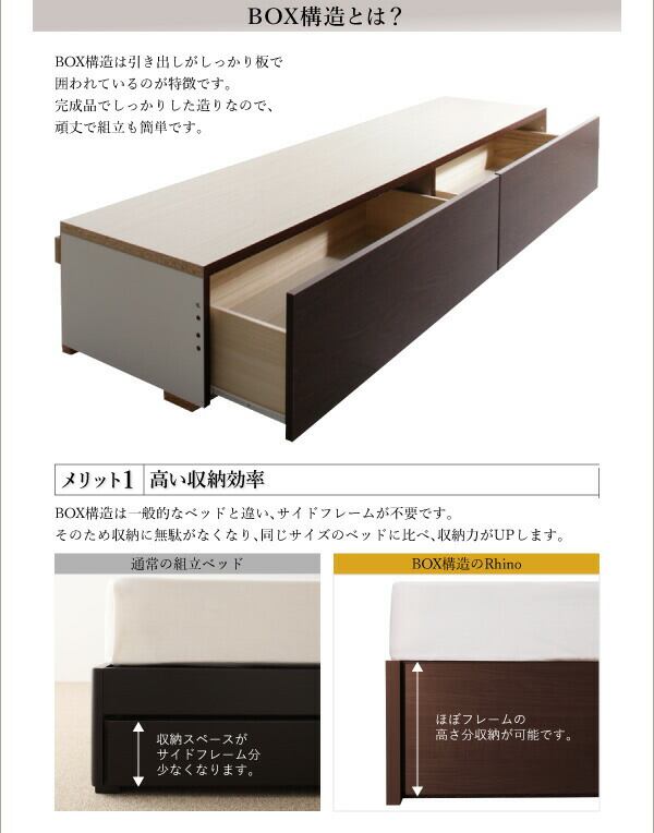 BOX構造は一般的なベッドと違い、サイドフレームが不要です。