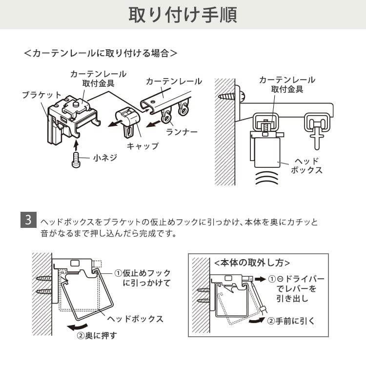 専用の金具でカーテンレールにも取り付けでき穴あけ不要なので賃貸でもご使用いただけます。
