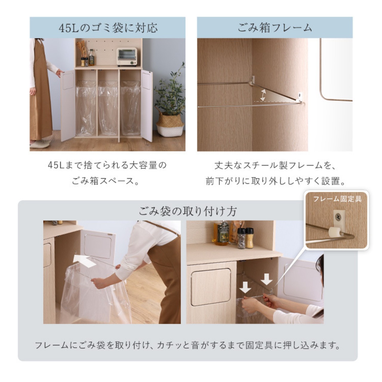 ごみ袋は45リットルまで使用できる大容量仕様になっています。