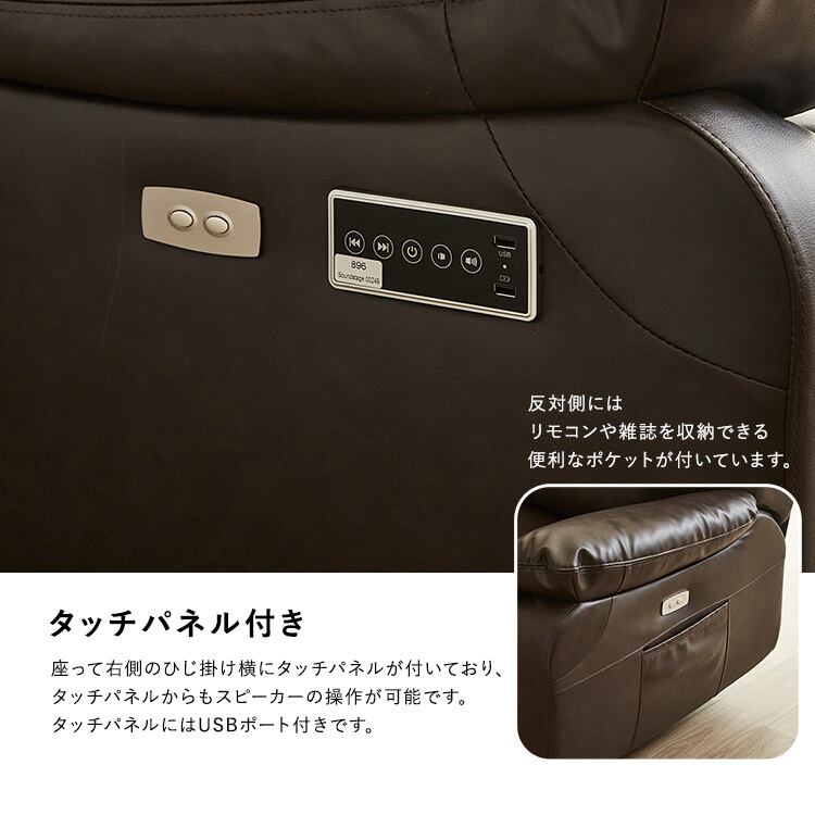 スピーカーはBluetooth対応で、ひじ掛け横のタッチパネルもしくはリモコンで簡単に操作が可能です。